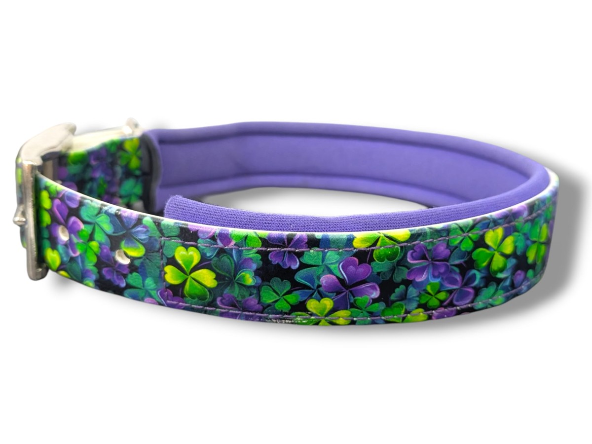 Glücksbringer für unterwegs: Biothane-Halsband mit Kleeblatt-Motiv. Dieses charmante Halsband besticht durch sein farbenfrohes Muster aus grünen und violetten Kleeblättern. Das hochwertige Biothane-Material macht es zum idealen Begleiter für jedes Wetter, da es extrem pflegeleicht und robust ist.