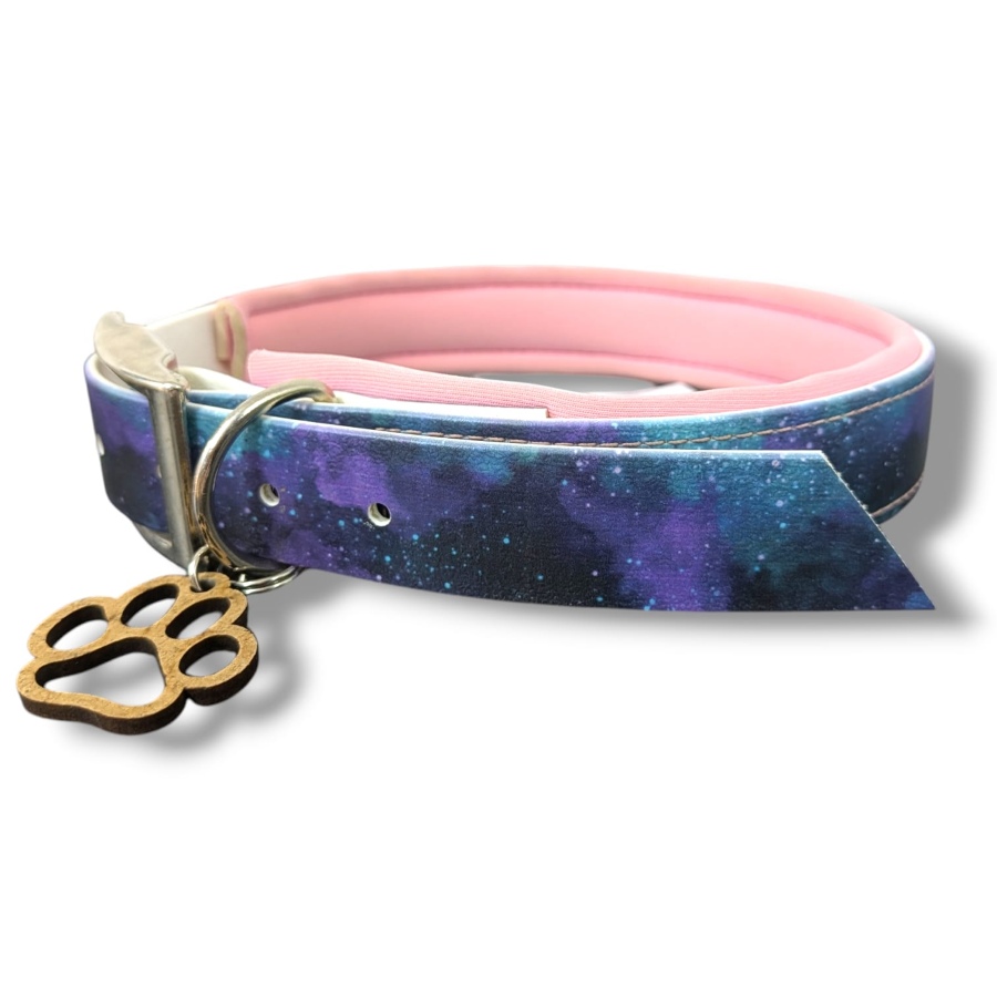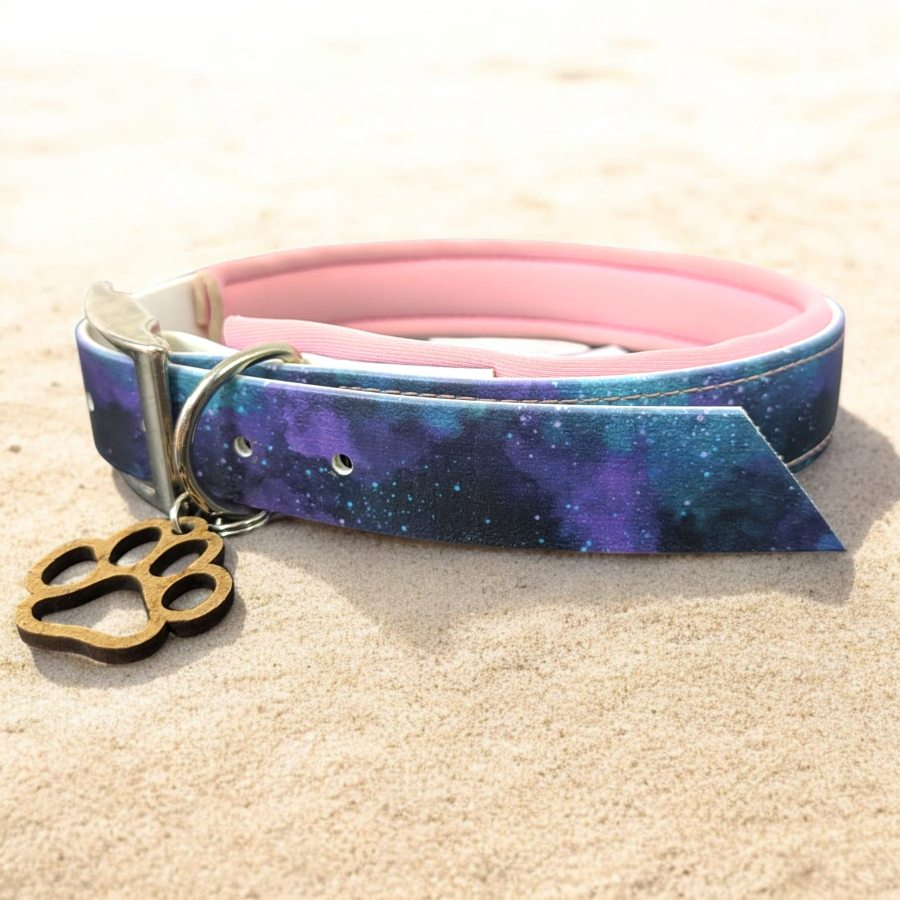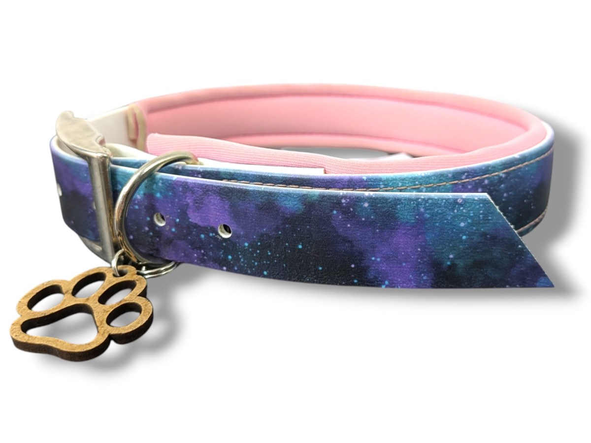 Galaktischer Look: Biothane-Halsband im Universum-Design. Mit seinem faszinierenden Print in Lila- und Blautönen bringt dieses Halsband die Sterne direkt an den Hals Ihres Hundes. Das robuste Biothane-Material ist nicht nur ein optisches Highlight, sondern auch extrem widerstandsfähig gegen Schmutz und Wasser.