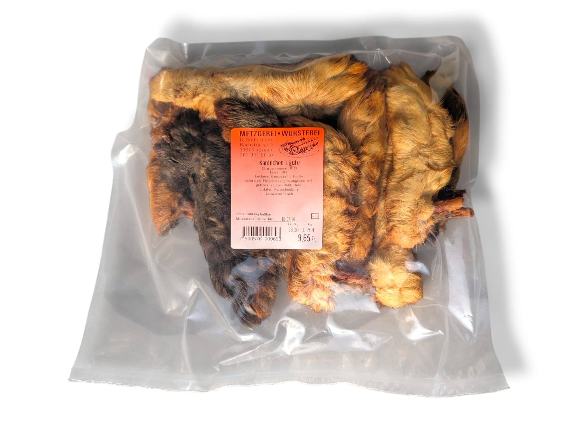 Knuspriger Kauspaß aus der Schweiz: Unsere getrockneten Kaninchen-Läufe sind der ideale, natürliche Snack für zwischendurch. Sie sind schonend angeräuchert und bieten Ihrem Hund eine artgerechte Beschäftigung.
